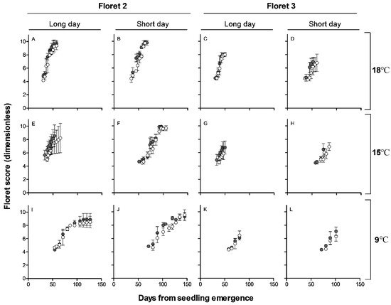 Relationship between floret development (floret score, scale proposed by Waddington et al. [44]) and days from seedling emergence for Eps-7D-late (open circles) and early (closed circles) for floret 2 (A,B,E,F,I,J) and floret 3 (C,D,G,H,K,L) under long and short days at 18 (A–D), 15 (E–H) and 9 °C (I–L). The error bars are the standard error of means, considering the means of floret scores from apical, central and basal spikelets.