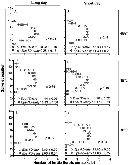 Number of fertile florets at anthesis per spikelet from basal to terminal spikelet for Eps-7D-late (open circles) and -early (closed circles) NILs under long (A,C,E) and shot days (B,D,F) at 18 (A,B), 15 (C,D) and 9 °C (E,F). Inside each panel are the fertile florets per spike with standard error of means and p value.