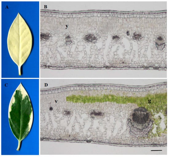 Figure 1. Comparative leaf structures between the full-yellow juvenile leaf (A) and mature variegated leaf (C) of I. altaclerensis ‘Belgica Aurea’. (B,D) were transverse sections of full-yellow and variegated leaf, respectively. Scale bar = 100 μm. y: full-yellow juvenile leaf; v: yellow sectors of variegated leaf; g: green sectors of variegated leaf.