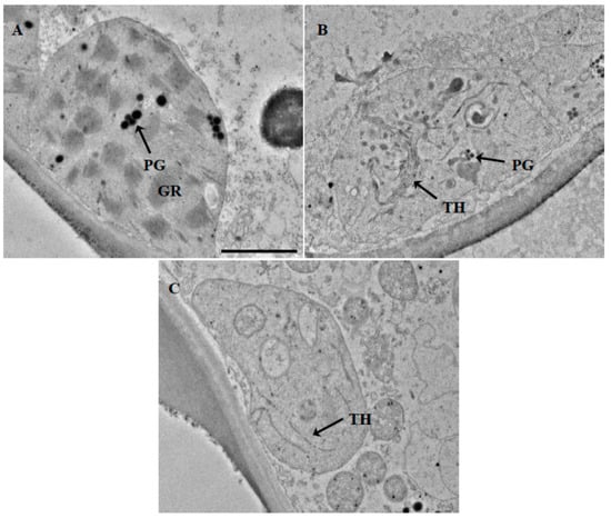 Figure 2. Ultrastructure of mesophyll cells from green (A) and yellow (C) sectors of variegated leaf, and the full-yellow juvenile leaf (B). GR: grana; TH: thylakoid; PG: plastoglobule. Scale bar = 2 μm.