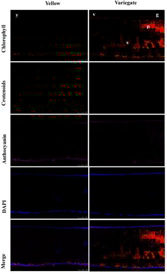 Figure 3. Tissue localization of chlorophyll, carotenoids, and anthocyanins in the leaves analyzed by confocal laser-scanning microscopy. p: palisade parenchyma; s: spongy parenchyma; DAPI: 4′,6-diamidino-2-phenylindole; DIC: differential interference contrast; y: full-yellow juvenile leaf; v: yellow sectors of variegated leaf; g: green sectors of variegated leaf. Scale bar = 100 μm.