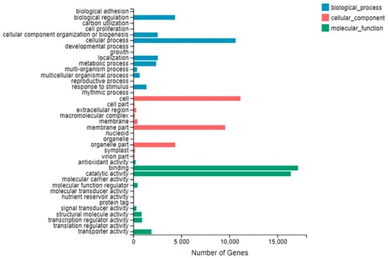 Using the Blast2GO program, 34,793 (44.25%) unigenes were categorized as ‘biological process’, ‘cellular component’ or ‘molecular function’. These three major categories were subdivided into 39 GO classes including 15 ‘biological process’, 11 ‘cellular component’ and 13 ‘molecular function’ (Figure 4, Table S2). In the ‘biological process’, ‘cellular process’ (10,639 unigenes, 42.42%), ‘biological regulation’ (4339 unigenes, 17.30%) and ‘localization’ (2554 unigenes, 10.18%) were the three prominent subclasses. For ‘cellular components’, ‘cell’ (11,144 unigenes, 42.20%), ‘membrane part’ (9556 unigenes, 36.18%) and ‘organelle part’ (4365 unigenes, 16.53%) were dominant. Furthermore, ‘binding’ (17,126 unigenes, 44.85%) and ‘catalytic activity’ (16,384 unigenes, 42.91%) were prominently represented in ‘molecular function’.