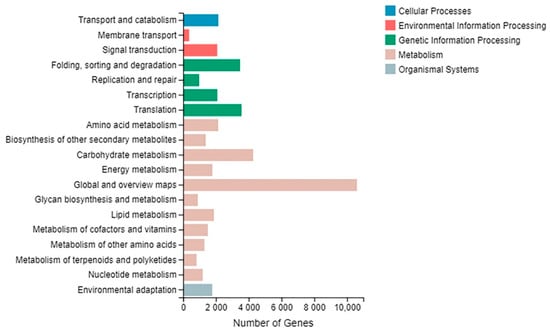 The KEGG analysis showed that 47,967 unigenes participated in five metabolic pathways, which were ‘cellular processes’, ‘environmental information processing’, ‘genetic information processing’, ‘metabolism’ and ‘organismal systems’ (Figure 5, Table S3). ‘Global and overview maps’ was the largest class (10,607 unigenes, 24.03%) followed by ‘carbohydrate metabolism’ (9.66%, 4266 unigenes).