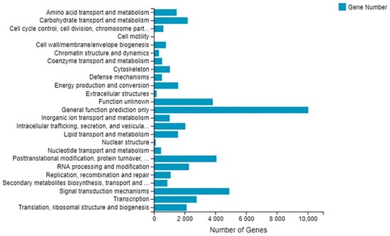 To classify orthologous gene products, 47,369 unigenes (60.24% of all unigenes) were divided into 25 KOG classifications (Figure 6, Table S4). Among them, ‘general function prediction only’ was the largest group (10,037 unigenes, 21.60%) and ‘signal transduction mechanisms’ ranked the second one (4904 unigenes, 10.55%).