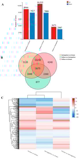 Changes in gene expression were determined by comparing yellow leaves (yellow) vs. the green part of the variegated leaves (green), the yellow part (variegation) vs. green part of the variegated leaves, and yellow vs. variegation. A total of 18,415 genes were differentially expressed between yellow and green, among which 10,535 genes were upregulated and 7880 genes were downregulated (Figure 7A). Between variegation and green, the expression level of 16,883 genes significantly changed, including 8966 upregulated genes and 7917 downregulated genes. In contrast, only 6660 genes were identified differentially expressed between yellow and variegation. Of these DEGs, 3673 were upregulated and 2987 were downregulated. Based on the analysis of three pairwise comparisons (yellow vs. green, variegation vs. green, yellow vs. variegation), 1675 DEGs were found to be shared by all three DEG sets in Venn diagram (Figure 7B, Table S5).