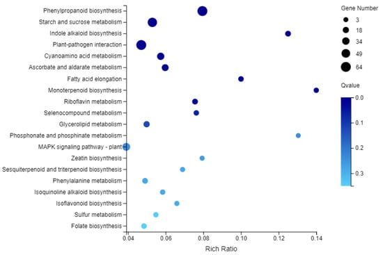To identify the specific biochemical pathways involved in the formation of leaf variegation, the DEGs were subjected to KEGG pathway enrichment analysis (Figure 9, Table S8). The DEGs were mapped to 123 pathways in the KEGG database. Among these 123 KEGG pathways, most of the DEGs (66.29% of all the DEGs) were related to ‘metabolism’. The most significantly enriched pathway was phenylpropanoid biosynthesis (Ko00940, 64 DEGs, 4.85%) and plant-pathogen interaction (Ko04626, 64 DEGs, 4.85%), followed by starch and sucrose metabolism (ko00500, 57 DEGs, 4.32%), MAPK signaling pathway-plant (ko04016, 39 DEGs, 2.95%) and carbon metabolism (ko01200, 36 DEGs, 2.73%). Moreover, 20 DEGs were found to be involved in carbon fixation in photosynthetic organisms (ko00710), and 6 DEGs were involved in photosynthesis (ko00195). One DEG was identified as photosynthesis-antenna proteins (ko00196) and 17 DEGs were associated with oxidative phosphorylation (ko0019). These results suggested that energy metabolism was different between the yellow and variegated leaves.
