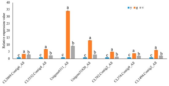 Figure 10. Quantitative real-time PCR verification of RNA-Seq data. Seven DEGs were selected for the verification of the reliability of the transcriptome sequencing results. The expression of β-actin was used as an internal reference. Data represent means ± SEM of three independent experiments. Different lowercase letters (a, b and c) indicated a significant difference among yellow leaves (y), green sectors of the variegated leaves (g) and yellow sectors of the variegated leaves (v) at p  <  0.05 level. a: significant difference compared to yellow sectors of variegated leaves; b: significant difference compared to green sectors of variegated leaves; c: significant difference compared to juvenile yellow leaves.