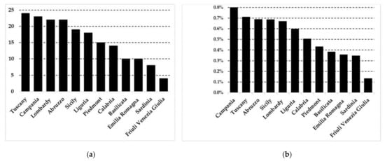As shown in Figure 1a, from the analyses carried out at a regional scale, I found that Tuscany has the largest number of species used in a single region (24), followed by Campania (23), Abruzzo and Lombardy (22 each). The Ethnobotanicity Index values are significantly lower than those of other Italian regions (range 5.4–11%) or Iberian Peninsula (range 8.8–27.9%) that are calculated on medicinal, cosmetic, veterinary, and food species [17,52,53]. Although it is not possible to make a comparison with the same use category, results suggested that the knowledge of wild plants used as flavoring is still consolidated in the above-mentioned regions that are also among the most species-rich in Italy [54]. (Figure 1b). Papers containing reports of wild plants specifically used for flavoring are reported in the Supplementary Materials.