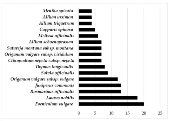Herbs and spices produced from aromatic plants are largely used to enhance food taste and palatability. Sometimes used as synonyms, the distinction between the two terms (herbs and spices) could be summarized as follows: herbs are types of plants whose leaves are used in cooking to give flavor to particular dishes, while a spice is defined as any of the various aromatic products obtained from plants in the form of powder or seeds or other plant parts and used to add taste to food (e.g., [9,10,11,12]). According to Van der Veen and Morales [13] neither definition fully conveys the array of plants nor the range of purposes for which such plants are used. A further lexical complication is that, in the ethnobotanical literature, there are many terms to indicate the use of plants in cooking, e.g., aromatic, aromatizer, condiment, flavoring, and spice. In the present review, I refer to the wild species (the whole plant or parts of it) used for flavoring various dishes in the Italian folk tradition. In this context, I use the term “wild” to refer to non-cultivated or naturally occurring plants gathered in the field, although sometimes for convenience of use, some species are grown or deliberately tolerated in home gardens [14,15]. In some cases, food plants are also eaten for their health-giving properties and many species are commonly used as herbal medicines in folk phytotherapy for the treatment of ailments [16,17].