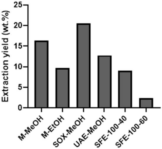 Extraction yield (EY) with different extraction methods (maceration with methanol—M-MeOH, maceration with ethanol—M-EtOH, Soxhlet extraction with methanol—SOX-MeOH, ultrasound-assisted extraction—UAE, supercritical CO2 extraction at 100 bar and 40 °C—SFE-100-40, supercritical CO2 extraction at 100 bar and 60 °C—SFE-100-60). Data are expressed as weight percentage (wt %) of the extracts obtained per 100 g of dry flower material.