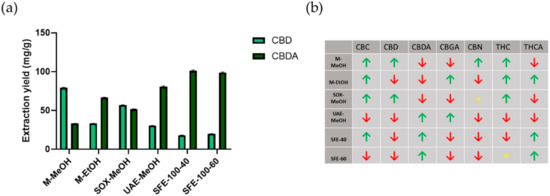 Comparison of cannabinoid extraction yields with different extraction methods. Panel (a) shows the amounts of CBD and CBDA obtained with different extraction methods (data are means ± SD from n = 3 replicate measurements), and panel (b) shows the trends of all cannabinoids analysed across extraction methods tested compared to the average (= means as the average, ↑ above average, and ↓ below average).