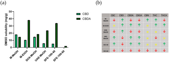 Comparison of cannabinoid content in Cannabis sativa extracts dissolved in DMSO. Panel (a) shows CBD and CBDA solubility in DMSO between different extraction methods (data are means ± SD from n = 3 replicate measurements). Panel (b) shows the trends of all cannabinoids dissolved in DMSO across extraction methods tested compared to the average (= means as the average, ↑ above average, and ↓ below average).