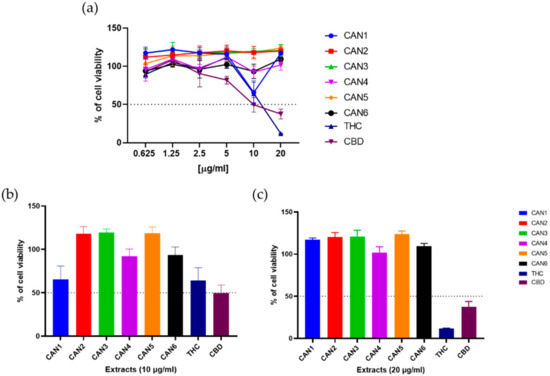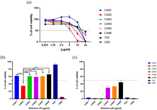 In contrast, a significant decrease in cell viability was observed when pure THC and CBD were used, resulting in a loss of cell viability to 11.7% and 37,5%, respectively, at 20 µg/mL (Figure 5c). Full data evaluating statistically significant differences between the samples are shown in Supplementary Materials, Tables S7 and S8.