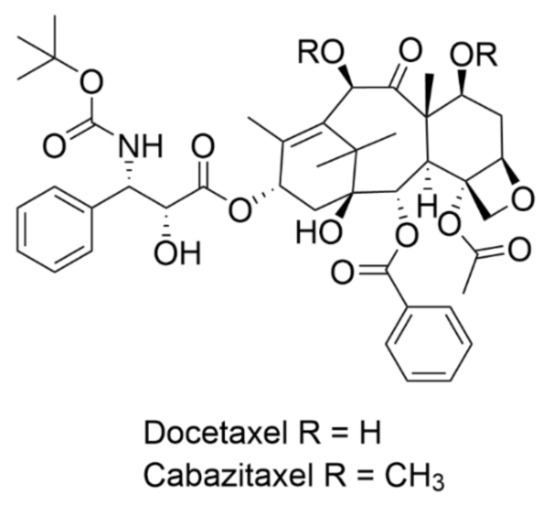 After the discovery of the unique mechanism of action of paclitaxel, which is tubulin binding and enhanced microtubule polymerization, a great effort has been made to further study taxanes and produce their synthetic and semisynthetic analogues with enhanced properties and improved water solubility. The most successful semisynthetic analogue of paclitaxel is docetaxel (Figure 2) marketed as Taxotere®. It was first approved by the European Medicines Agency (EMA) in 1995, which was followed by the U.S. Food and Drug Administration (FDA) authorization in 1996 for the treatment of breast cancer [3]. Another clinically used semisynthetic taxane is cabazitaxel (Jevtana®), which was approved by the FDA in 2010 for prostate cancer treatment [4].
