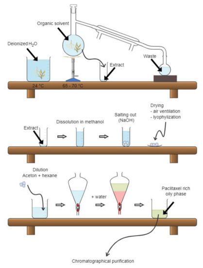 The basic paclitaxel isolation process was described only in a patent. We provide a summary of this process, though we are concerned about the quality of the protocol, since patents are not independently reviewed. The paclitaxel isolation process (Figure 4) begins with the rinsing of raw plant material, preferably bark, with deionized water for 3 h. After the water is removed, extraction into organic solvents (alcohols, ketones, or a mixture of both) follows. The extract is transferred into a tank and heated up to 65–70 °C, which results in the removal of the organic solvents by a distillation process. The residual solution is transferred into another tank, and the biomass is concentrated by salting out from the solution previously diluted with methanol and water. The precipitated biomass is then separated and dried by ventilation or lyophilization. To purify the obtained biomass, it is dissolved in the mixture of acetone and hexane and, subsequently, water is added into the solution to form the paclitaxel-rich oily phase. This phase is then chromatographically purified and the solution crystalized. This process, which can be repeated several times to achieve higher purity, comprises mixing of the oily-phase with a silica gel and drying by ventilation. The silica gel coated with the paclitaxel phase is then applied onto a chromatography column filled with the same type of silica gel to further purify the sample using an elution mixture of 35% acetone and 65% hexane. Then, the paclitaxel-containing fractions are combined, dried, and dissolved in pure acetone. Finally, paclitaxel is crystallized by adding hexane into the solution [7].
