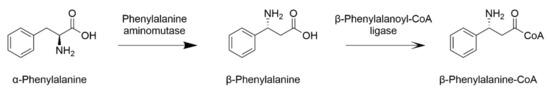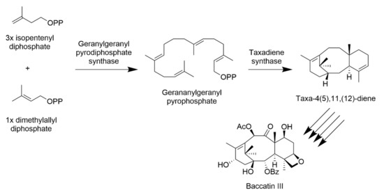 The starting compound for taxane biosynthesis is geranylgeranyl pyrophosphate (GGPP), which is synthesized from three isopentenyl diphosphate units and one molecule of dimethylallyl diphosphate by geranylgeranyl pyrophosphate synthase (EC 2.5.1.1). In the cyclase phase, GGPP then cyclizes to form the first compound of the diterpenoid pathway with the taxane key motif, taxadiene (taxa-4(5),11,(12)-diene). This key reaction is catalyzed by taxadiene synthase (EC 4.2.3.17). Briefly, in the oxidation phase, taxadiene undergoes eight cytochrome P450-mediated oxygenations, five acetyl/aroyl transferase steps, and one epoxidation. Then, a reaction catalyzed by phenylalanine aminomutase (EC 5.4.3.10) takes place, which is followed by N-benzoylation and two coenzymes A esterifications. Together, paclitaxel biosynthesis from GGPP includes 19 enzymatic steps; it is reviewed in detail in [28].