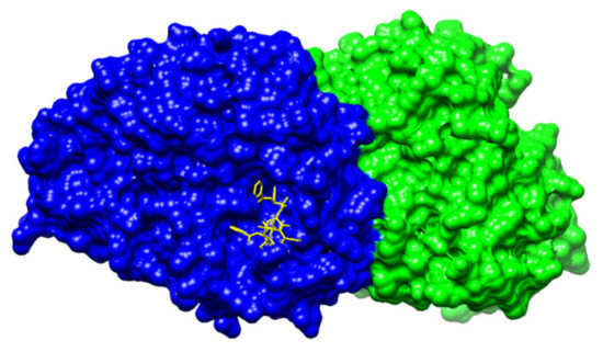 The binding site of paclitaxel on tubulin dimer, PDB (Protein Data Bank) structure 1jff adapted by Chimera software.
