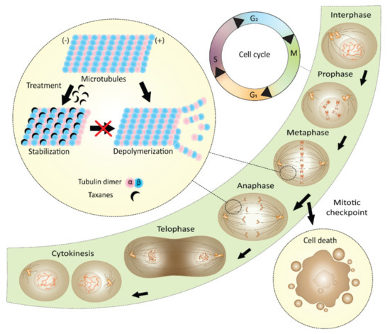 In mitotic cells, taxanes prevent microtubule attachment to the kinetochores. The unattached kinetochores cause mitotic arrest and the cell undergoes mitotic catastrophe, which leads to its death [50] (Figure 8), which can occur by different mechanisms. Taxanes trigger several molecular pathways: (i) induce phosphorylation of the anti-apoptotic factor B-cell lymphoma 2 (Bcl-2) [51], (ii) increase production of the cellular tumor antigen p53 (p53) even at very low concentrations not affecting the cell cycle [52], and (iii) induce endoplasmic reticulum stress. In connection to the last point mentioned, increased levels of certain factors, such as caspase 3 and 4 or C/EBP homologous protein, have been described in paclitaxel-treated cells. Endoplasmic reticulum stress plays an important role in cancer chemotherapy-induced neurotoxicity, which is an unpleasant side effect often occurring after treatment [53].
