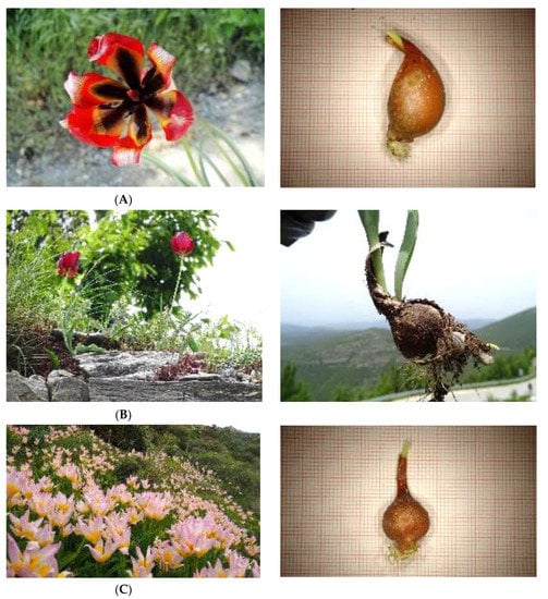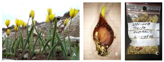 Wild-growing Greek tulips endemic to the island of Crete and individual bulbs collected for ex situ conservation in the frame of TULIPS.GR: (A) Tulipa bakeri and (B) T. doerfleri assessed as Critically Endangered [27], and (C) T. cretica (photo: V. Papiomytoglou) assessed as Endangered [27].