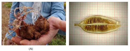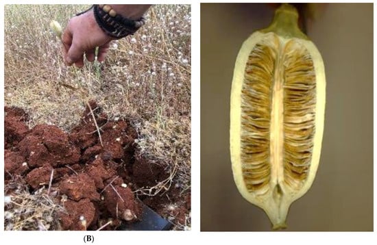 Dormant bulbs and capsules with ripe seeds collected for ex situ conservation from wild-growing and protected populations of Greek tulip species assessed as threatened with extinction [25,27]: (A) T. goulimyi, a local endemic of Peloponnese, Kythira-Antikythira and west Crete, assessed as Endangered [27]; (B) T. undulatifolia, an endemic to Southern Balkans and west and central Anatolia (Turkey), assessed as Vulnerable [25].