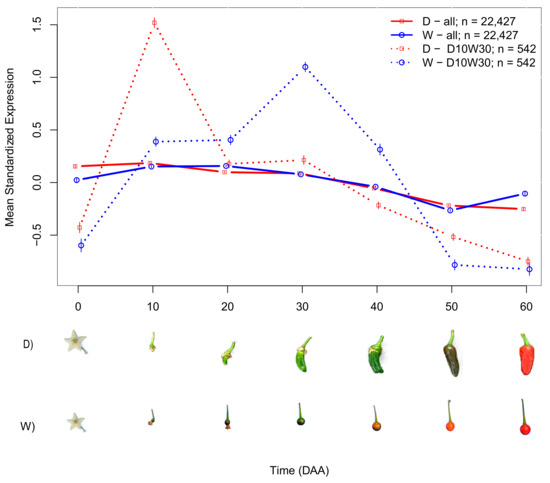 Average SEPs (Standardized Expression Profiles) for groups of genes in domesticated (D) and wild (W) accessions. Continuous colored lines (red and blue for domesticated (D) and wild (W), respectively) link the means of standardized gene expression at each time point for the complete set of expressed genes (n = 22,427). Dashed lines link the means of standardized gene expression at each time point for the n = 542 genes that presented the maximum expression at 10 DAA in D, while the maximum expression was reached at 30 DAA in W. These 542 genes form the group “D10W30” (see text). Representative miniature photographs illustrate the approximate fruit development of the D and W accessions at each time point. Photographs of fruits are not at the same scale.