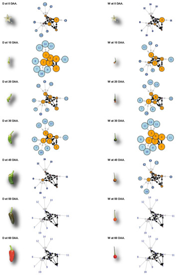 For a better appreciation of the changes that occur in the individual standardized expression of the genes included in the network of Figure 3, Figure 4 presents a grid of the time and the accession groups, but in this case, the sizes of the circles representing genes vary in proportion to their individual standardized expression over time (rows; from 0 to 60 DAA) and sets of accessions (columns; D on the left-hand side and W on the right -hand side). Representative miniature photographs show the approximate fruit development stage for the D and W accessions.