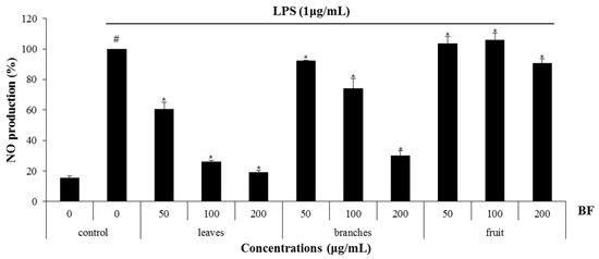 RAW264.7 cells were plated in a 12-well plate overnight. Cells were pretreated with each part (leaves, branches and fruit) of BF at the indicated concentrations for 2 h, and then co-treated with LPS (1 μg/mL) for an additional 18 h. After that, 50 μL of the media was mixed with 50 μL of Griess reagent (Sigma Aldrich, St. Louis, MO, USA). The mixture was incubated for an additional 5 min at room temperature and the absorbance was measured at 540 nm (Perkin Elmer, Waltham, MA, USA).