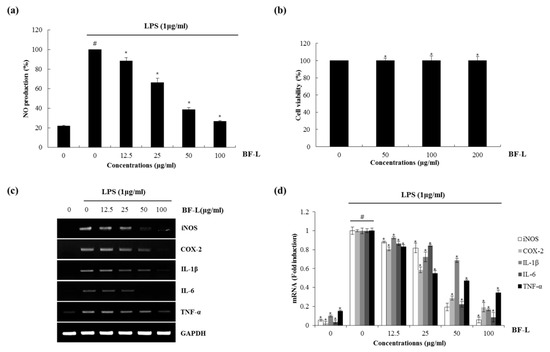The effect of BF-L on NO production and iNOS, COX-2, IL-1β, IL-6 and TNF-α expression in LPS-stimulated RAW264.7 cells. (a) RAW264.7 cells were pre-treated with BF-L at the indicated concentrations for 6 h and then co-treated with LPS (1 μg/mL) for an additional 18 h. After treatment, NO production was measured using the media and Griess reagent. (b) RAW264.7 cells were treated with BF-L at the indicated concentrations for 24 h. Cell viability was measured using MTT assay system and expressed as % cell viability. (c,d) For RT-PCR, RAW264.7 cells were pre-treated with BF-L at the indicated concentrations for 6 h and then co-treated with LPS (1 μg/mL) for an additional 18 h. Total RNA was isolated and RT-PCR was performed for iNOS, COX-2, IL-1β, IL-6 and TNF-α values given are the mean ± SD (n = 3). * p < 0.05 compared to LPS treatment without BF-L. # p < 0.05 compared to the cells without BF-L, and * p < 0.05 compared to the cells treated with LPS alone. GAPDH was used as an internal control for RT-PCR.