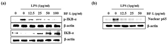 The NF-κB pathway does indeed regulate pro-inflammatory cytokine production, leukocyte recruitment, or cell survival, which are key contributors to the inflammatory response [21]. Therefore, in order to examine the effect of BF-L on the inhibition of NF-κB activity, as shown in Figure 3a, the treatment of BF-L in LPS-induced RAW264.7 cells suppressed the phosphorylation and degradation of IκB in a concentration-dependent manner (0, 12.5, 25, 50 and 100 μg/mL). As shown in Figure 3b, it was confirmed that BF-L inhibited nuclear translocation of p65. These results suggest that BF-L has an anti-inflammatory effect by inhibiting NF-κB activity.
