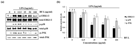 Effect of BF-L on MAPKssignaling activation in LPS-stimulated RAW264.7 cells. (a) and (b) RAW264.7 cells were pretreated with BF-L for 6 h and then co-treated with LPS (1 μg/mL) for 30 min. For Western blot analysis, the cell lysates were subjected to SDS-PAGE and the Western blot was performed using antibodies against p-ERK1/2, p-p38, p-JNK, total ERK1/2, total p38 and total JNK. # p < 0.05 compared to the cells without BF-L, and * p < 0.05 compared to the cells treated with LPS alone.