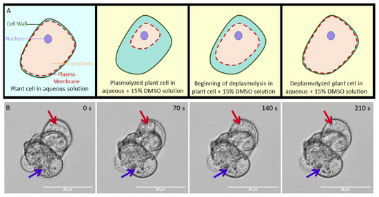 When plant cells are exposed to CPAs, they can go through a process of plasmolysis and deplasmolysis [9,10,11], as shown in Figure 1A. Plasmolysis is attributed to the change in osmotic pressure when a cell is exposed to a cryoprotectant solution, observable when the plasma membrane shrinks away from the cell wall. This is seen in Figure 1, Panel B, in the image acquired 70 s after exposure to 15% dimethyl sulfoxide (DMSO), a commonly used CPA in plant and animal cryopreservation. Following plasmolysis, the cell swells until the cell membrane reaches the cell wall in a process called deplasmolysis. Deplasmolysis is commonly attributed to CPAs entering the cell [9], as it is generally seen when cells are exposed to cell-permeating cryoprotectants, like DMSO. However, simple attribution of CPAs entering the cell to cause deplasmolysis does not explain why some cells, like the cell indicated by the purple arrow in Figure 1B, do not appear to respond to DMSO exposure with a plasmolysis/deplasmolysis cycle, while others, like the cell indicated by the red arrow, appear to respond as expected, plasmolyzing within 70 s of exposure and deplasmolyzing after 210 s of exposure, at room temperature. Both cells had movement within their cytoplasm, leading us to believe that they were both alive. This difference in response was observed in many different exposure experiments and with cells in clusters ranging from only a few cells to hundreds of cells (see Supplementary Information).