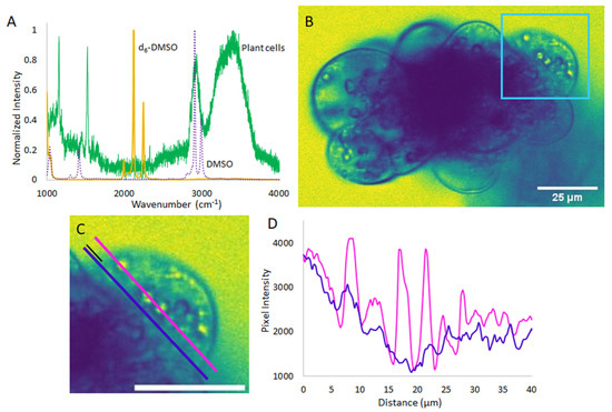 (A): Spontaneous Raman spectra of d6-DMSO (yellow), DMSO (purple, dashed), and the rice cells (green), showing the shift in DMSO vibrational frequency upon deuteration away from significant peaks in the cell spectrum. (B): Representative CARS microscopy image of rice cells imaged in resonance with the d6-DMSO stretching vibrational mode (yellow trace in A). Signal from d6-DMSO appears yellow while places blocking the d6-DMSO signal appear blue. (C): Expanded view of cell outlined in light blue in B. Parallel pink and dark blue line profiles bisect three organelles and the relatively uniform space away from organelles, respectively. Both lines start 5 µm outside of the cell, a distance shown with the small black line, and stretch, parallel, across approximately 40 µm. (D): Pixel intensity along pink and dark blue line profiles from C as a function of distance along the line. Scale bars in C and D are 25 µm. Images artificially colored with ImageJ LUT, mpl-viridis [29].