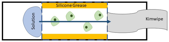Rudimentary perfusion chamber showing plant cells in green, silicone grease in yellow, wicked solution in blue, and Kimwipe in grey on a white microscope slide (outlined in solid black). 25 × 50 mm cover slip placed on top of grease shown in blue dashed lines.