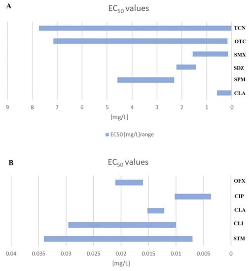 The summary of the EC50 values expressed in mg/L of the ten most toxic antibiotics towards freshwater and marine green algae (A) and cyanobacteria (B) (detailed information can be found in Table S1). (CLA—clarithromycin, CLI—clindamycin, CIP—ciprofloxacin, OFX—ofloxacin, OTC—oxytetracycline, SDZ—sulfadiazine, SMX—sulfamethoxazole, SPM—spiramycin, STM—streptomycin, TCN—tetracycline).