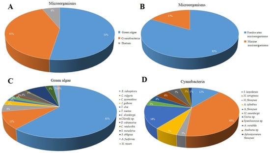 The percent distribution of the toxicological studies on antibiotics based on the number of EC50 reports according to different algal groups (multiple data obtained in independent studies). A—green algae, cyanobacteria, diatom; B—freshwater vs. marine microorganisms; C—green algae; D—cyanobacteria.