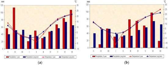 Weather characteristics of the vegetative seasons: Average monthly air temperature (°C) and precipitation (mm) and perennial average for locations in the first year (a); average monthly air temperature (°C) and precipitation (mm) and perennial average for locations in the second year (b).