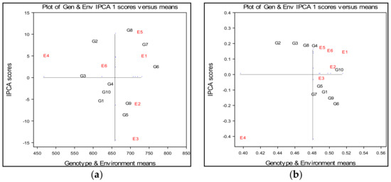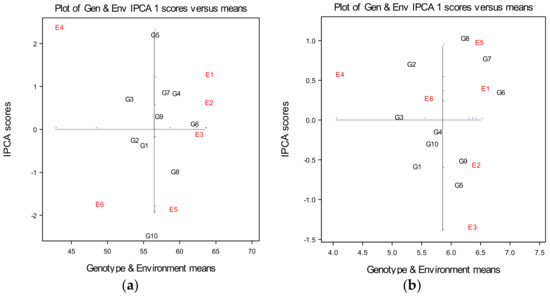 Based on the graphic presentation of the interaction of genotypes and environments, ten winter wheat genotypes differed in genotype by environment interaction. Wheat genotype G6 (Evropa) expressed the most stable reaction, showing a PCA1 score quite near to 0. Genotypes G1, G2, G3 and G9 showed values close to zero and they had small interaction effects, small contribution to the GE interaction and fitted well into the additive model. Genotypes G4, G7 and G9 showed higher distance from origin, while genotypes G10 and G5 were furthest from the PCA axis, thus they proved to be the most unstable and contributed a lot to the GE interaction captured by the first axis IPCA1. These two genotypes showed the highest interaction at the level of the whole experiment. Genotype G6 appeared to be better adapted to the E3 and E2 environments, which corresponded to soil treatments of 25 and 50 tha−1 phosphogypsum, having a mean value of plant height above the overall mean. Genotypes G9, G7 and G4 expressed also a positive effect in E3 and E2 environments, which correspond to environments with 25 and 50 tha−1 phosphogypsum applied, keeping their average quite above the level of overall mean. Genotype G8 appeared to be better adapted to conditions of E3 and E5, which corresponded to soil treatments of 25 and 50 tha−1 phosphogypsum, while genotypes G2 and G1 were better adapted to conditions of E6, which corresponded to soil treatment of 50 tha−1 phosphogypsum. Genotype G3 appeared to be adapted to conditions of E2, E3 and E1 environments, keeping its average below the overall mean (Figure 2a). According to Gauch [32], the genotypes at the top of the graph table have positive G × E interactions with environments and those genotypes at the bottom have negative G × E interactions with environments. Therefore, genotypes at the top of graph (G3, G4, G5, G6, G7 and G9) showed positive G × E interactions with environments, while genotypes which were at the bottom (G1, G2, G8 and G10) showed negative G × E interactions with environments (Figure 2a).