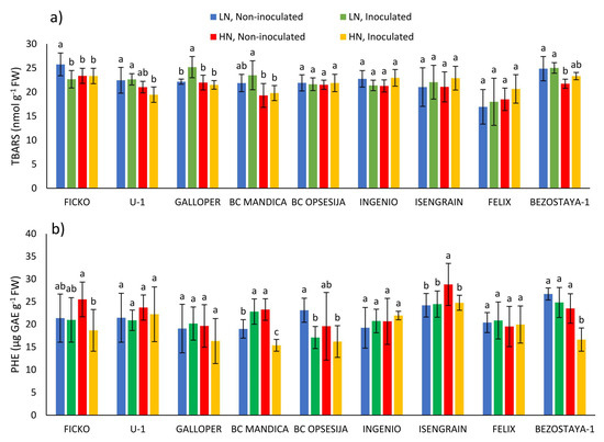 TBARS content (a) and soluble phenolic (PHE) content (b) in spikes of nine wheat varieties under different nitrogen (LN—low nitrogen; HN—high nitrogen) and Fusarium (non-inoculated and inoculated) treatments. Values are means of six replicates ± standard deviation (SD). Different letters above the bars indicate significant differences according to Fisher’s LSD test (p ≤ 0.05) among different treatments in each variety separately.