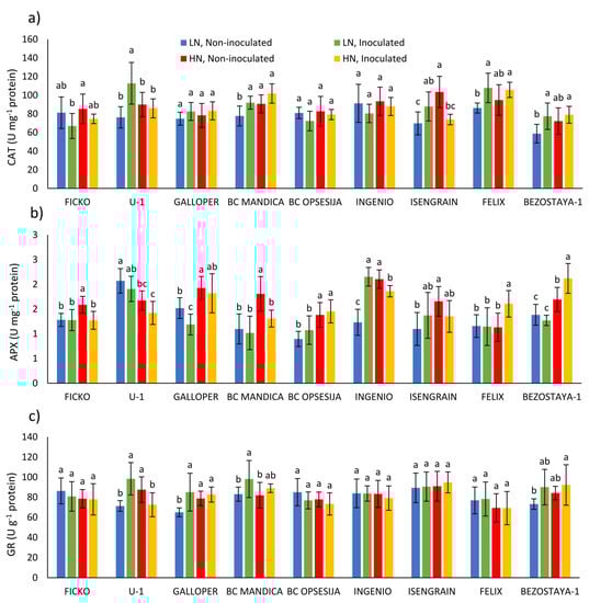 Antioxidant enzyme activity: catalase (CAT; (a)), ascorbate peroxidase (APX; (b)), and glutathione reductase (GR; (c)) in spikes of nine wheat varieties under different nitrogen (LN—low nitrogen; HN—high nitrogen) and Fusarium (non-inoculated and inoculated) treatments. Values are means of six replicates ± standard deviation (SD). Different letters above the bars indicate significant differences according to Fisher’s LSD test (p ≤ 0.05) among different treatments in each variety separately.