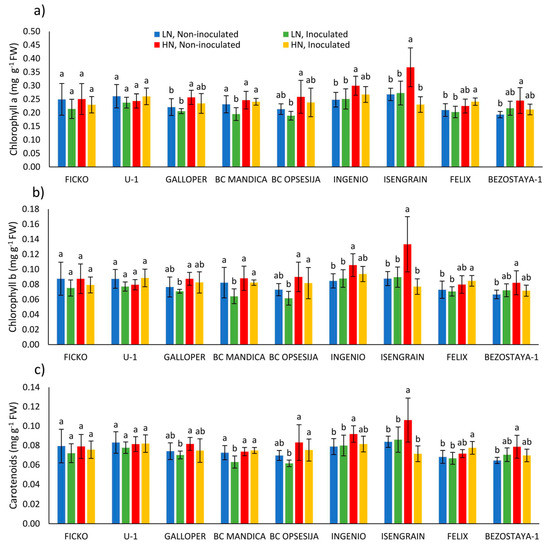 Chlorophyll a (a), chlorophyll b (b), and carotenoids (c) content in spikes of nine wheat varieties under different nitrogen (LN—low nitrogen; HN—high nitrogen) and Fusarium (non-inoculated and inoculated) treatments. Values are means of six replicates ± standard deviation (SD). Different letters above the bars indicate significant differences according to Fisher’s LSD test (p ≤ 0.05) among different treatment in each variety separately.