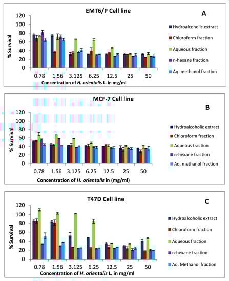 Different cell lines were distributed (100 μL/well) into 96-well tissue culture plates (flat bottom) and seeded at 15,000 cells/well in complete tissue culture medium. This cell density was selected as it gives confluence layer after 48 h incubation for the cell lines used in this study. After 24 h, the media in each well were removed and then the attached cells were treated in triplicate with H. orientalis L. different extracts (initially dissolved in 0.1% DMSO). Using serial dilution technique, the extract and fractions were added in concentrations between 50–0.78 mg/mL and re-incubated for 48 h. Cell viability was measured using MTT [3-(4,5-Dimethylthiazol-2-yl)-2,5-diphenyltetrazolium bromide] assay kit (Sigma, USA) as previously described [40]. Briefly, after 48 h incubation with 100 μL of extracts and fractions, media was removed from each well and 10 μL MTT was added. Cells were incubated with MTT for 3 h followed by adding stop solution. One hour after adding the stop solution, the developed color was measured using microplate reader. Percentage survival was estimated by comparing the absorbance of treated cells to the negative control (tissue culture media and 0.1% DMSO). The half maximal inhibitory concentration (IC₅₀) was calculated using non-linear regression in SPSS. The assay was conducted on three breast cancer cell lines (MCF-7, T47D, and EMT6/P) and one normal cell line (Vero). Vero cell line was used to determine the toxicity of extracts on normal cells.