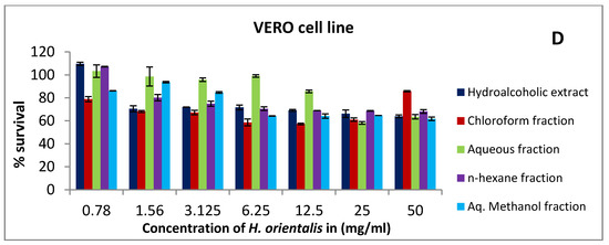 The antiproliferative activity of H. orientalis L. extract and fractions against: (A) EMT6/P cell line, (B) MCF-7 cell line, (C) T47D cell line, (D) Vero cell line using concentrations between 0.78 to 50 mg/mL. Percentage of cell viability (%) was calculated as (OD of treated cells/OD of control cells * 100). Results are expressed as means of three independent experiments (bars) ± SEM (lines).