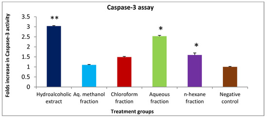 Caspase-3 activity assay was used to measure the ability of H. orientalis L. to induce the programmed cell death. Hydroalcoholic (6.12 mg/mL), chloroform (3.53 mg/mL), aqueous (11.38 mg/mL), and n-hexane (0.59 mg/mL) significantly enhanced caspase-3 activity. Both hydroalcoholic extract and aqueous fraction enhanced caspase-3 activity by 3- and 2.5-fold of the negative control, respectively (Figure 2). However, aq. methanol fraction had no effect on caspase-3 activity.