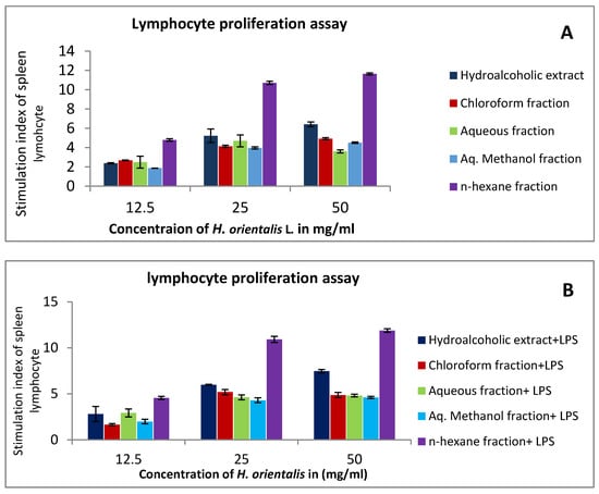 Human immune system is composed of sophisticated network of cells and organs that work together to provide protection against different pathogens [28]. In our study, we evaluated the change in the function of innate and acquired immune response after treatment with different extract and fractions from H. orientalis L. In the lymphocyte proliferation assay, the highest response was observed in n-hexane fraction followed by hydroalcoholic extract. Both activated lymphocyte proliferation in the presence and absence of mitogens (lipopolysaccharide (LPS) and concanavalin A (Con-A)).