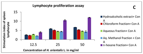 The effect of H. orientalis L. extract and fractions on the splenic lymphocytes’ proliferation using different concentrations (12.5–50 mg/mL) in the presence and absence of mitogens: (A) in the absence of Con A (concanavalin A) and LPS (lipopolysaccharide); (B) in the presence of (4 μg/mL) of LPS; (C) in the presence of (5 μg/mL) of Con A. Results are expressed as means (bars) ± SEM (lines).