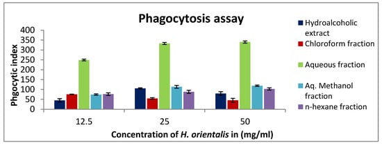 A concentration-dependent enhancement of phagocytic activity was observed in macrophages treated with 12.5–50 mg/mL H. orientalis L. (Figure 4). At a concentration of 50 mg/mL, the aqueous fraction showed the highest stimulation of peritoneal phagocytic activity compared to the negative control, followed by aqueous methanol fraction.