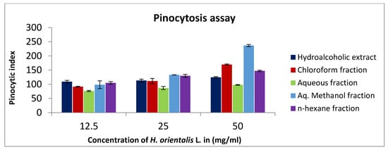 Neutral red method was used to demonstrate the pinocytic activity after treatment with different H. orientalis L. extract and fractions. At concentration of 50 mg/mL, aqueous methanol fraction showed the highest activity with pinocytic index value of 236 (Figure 5). On the other hand, other fractions were less active compared to the negative control.