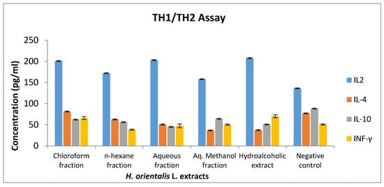 The effect of H. orientalis L. extract and fractions on IL-2, IL-4, IL-10, and IFN-γ level at concentration of 50 mg/mL. TH1/THI murine assay kit was used to measure the effect of the H. orientalis on cytokines. Secretion of IL-2 was enhanced in the presence of hydroalcoholic extract and chloroform fraction. Results are expressed as means of three independent experiments (bars) ± SEM (lines).