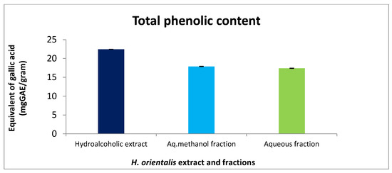 Foline–Ciocalteu assay was applied to detect the content of phenol in H. orientalis L. extracts. Hydroalcoholic extract and aq. methanol fraction showed the highest equivalent of gallic acid with values of 22.4 and 17.8 mg GAE/g dry weight, respectively (Figure 7).