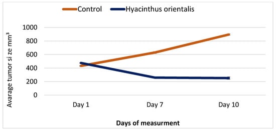 A plot demonstrated the changes in average tumor size (mm³) vs. time in (days) of treatment with H. orientalis L. hydroalcoholic extract in EMT6/P cell line.
